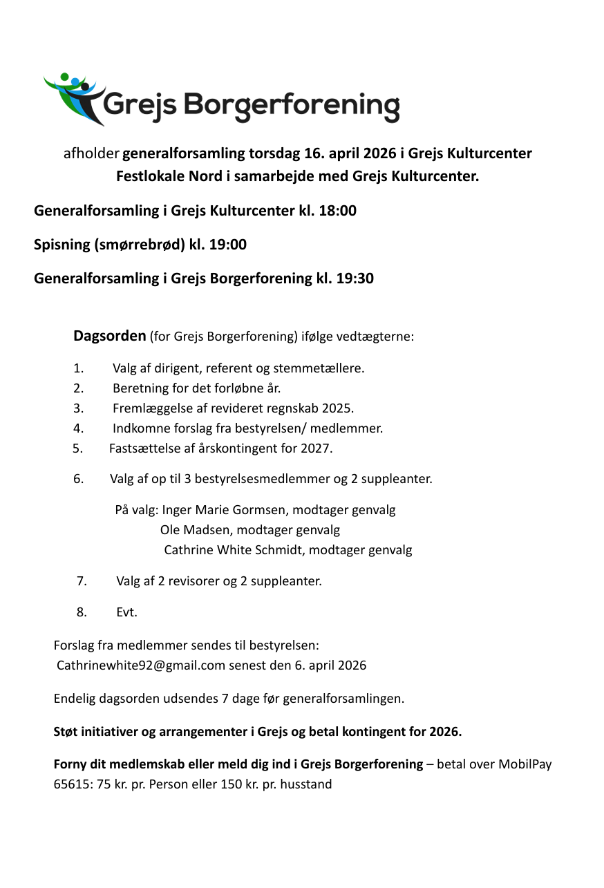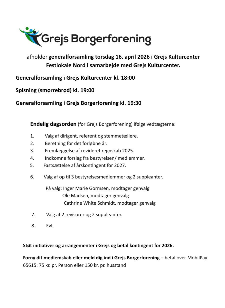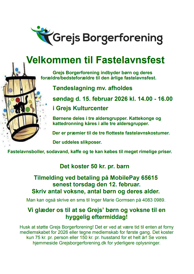 Alle arrangementer annonceres på grejs.dk, INFO tavlen, fb Grejs Borgerforening og www.grejsborgerforening.dk